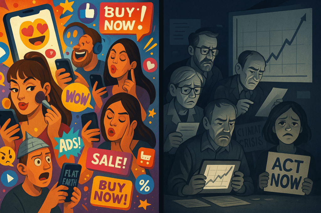 Humanity has outdone itself in finding ways to shout into the void with astonishing vigour and almost no meaningful return. Social media is bombarded with 700 comment threads debating whether tattooed eyebrows are empowering or oppressive, while glaciers the size of Luxembourg quietly detach and drift out to sea. Thousands of hours of YouTube videos and Reddit threads are devoted to explaining why airplanes don’t fly off the edge, while actual scientists weep into their test tubes. Deeply philosophical Instagram reels on “authenticity” are delivered from ‘influencers’ in their hot tubs in Dubai, followed by an affiliate link for discounted collagen powder. On X the exchanges are getting heated… should dogs be vegan? Raging factions. Faked studies. Emotional appeals. Meanwhile, the dog is in the corner eating a sock.