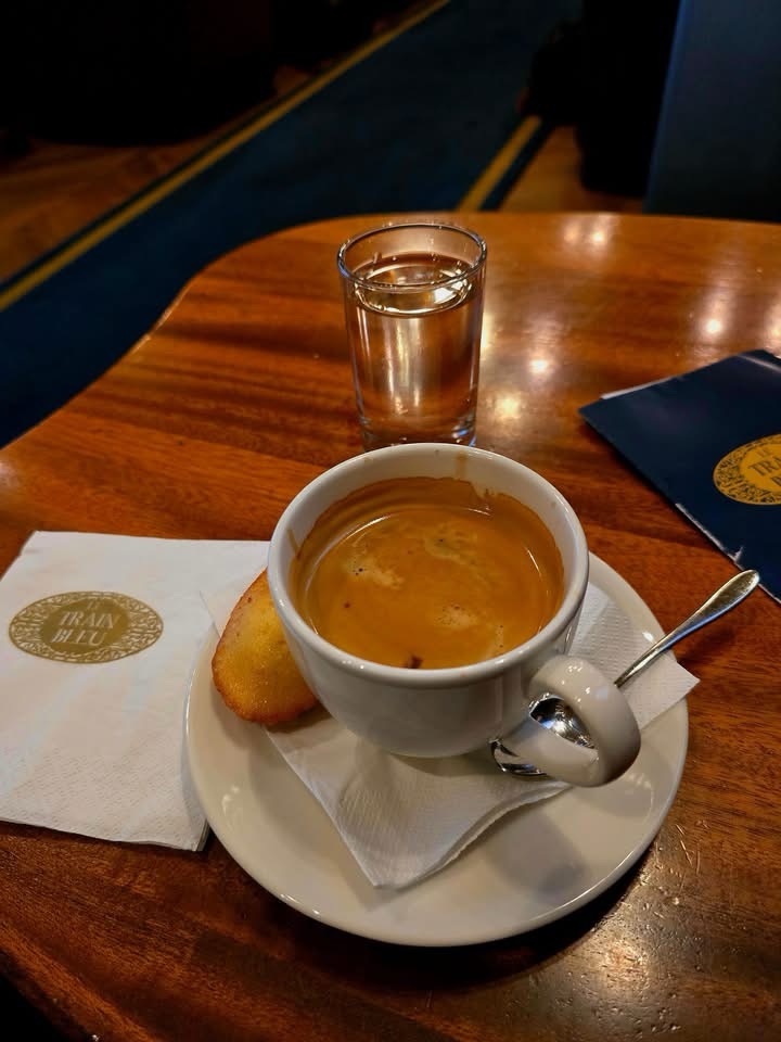 Well, if one must wait for a delayed TGV, this is surely how to do it – sinking into a leather armchair beneath chandeliers and gilt, in the quiet splendour of Le Train Bleu. 10€ may seem steep for a double shot of caffeine – even a Finca El Platanillo 100% Guatemalan Arabica, cultivated at 1450m – but context is everything – and here, nestled into a leather armchair at Le Train Bleu, you are not paying for coffee so much as an experience.