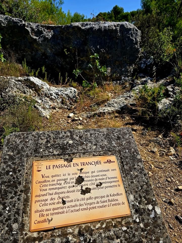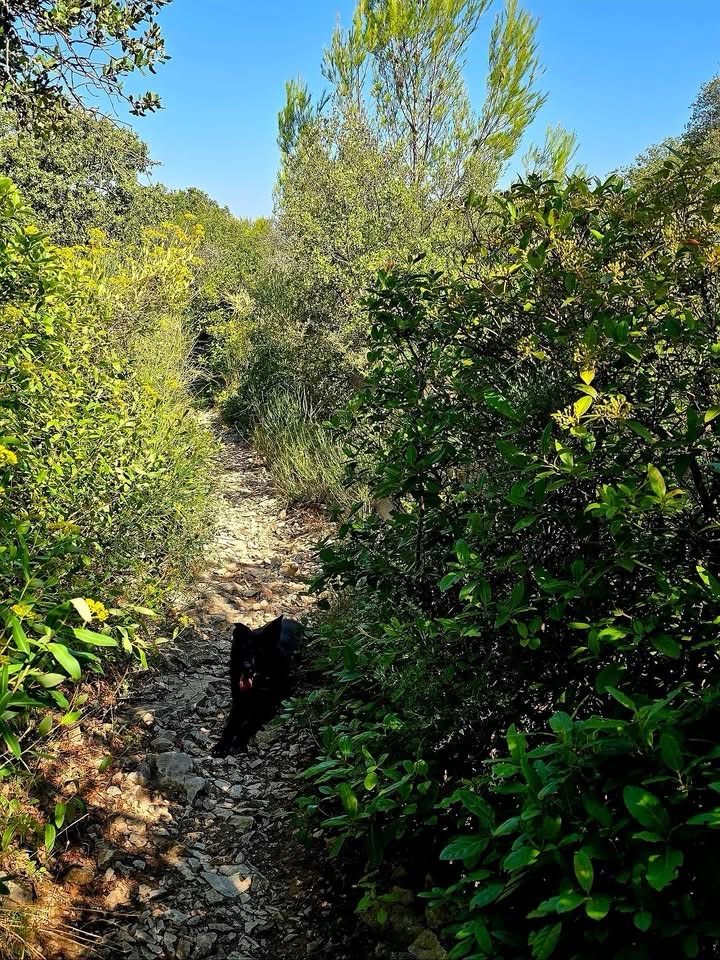Saint-Jacques has been occupied since the Neolithic. At La Grande Baume, a cave still sheltering in the limestone, our ancestors left flints and arrowheads – but no trace of themselves beyond that. Romans later carved their passage through the rock at Le Passage en Tranchée, their carts biting ruts deep into the stone. Quarrymen followed in later centuries, chiselling into the hillsides at Les Carrières, leaving behind the ghost grid of their labour. The paths loops through it all, past dry gorges, shaded ravines, low holm (evergreen) oaks and sun-shattered cliffs. Glo, wiser than me, took the steeper stretches at her own unhurried pace, pausing to sprawl in the shade with the confidence of a creature who knows the heat will always outlast us.