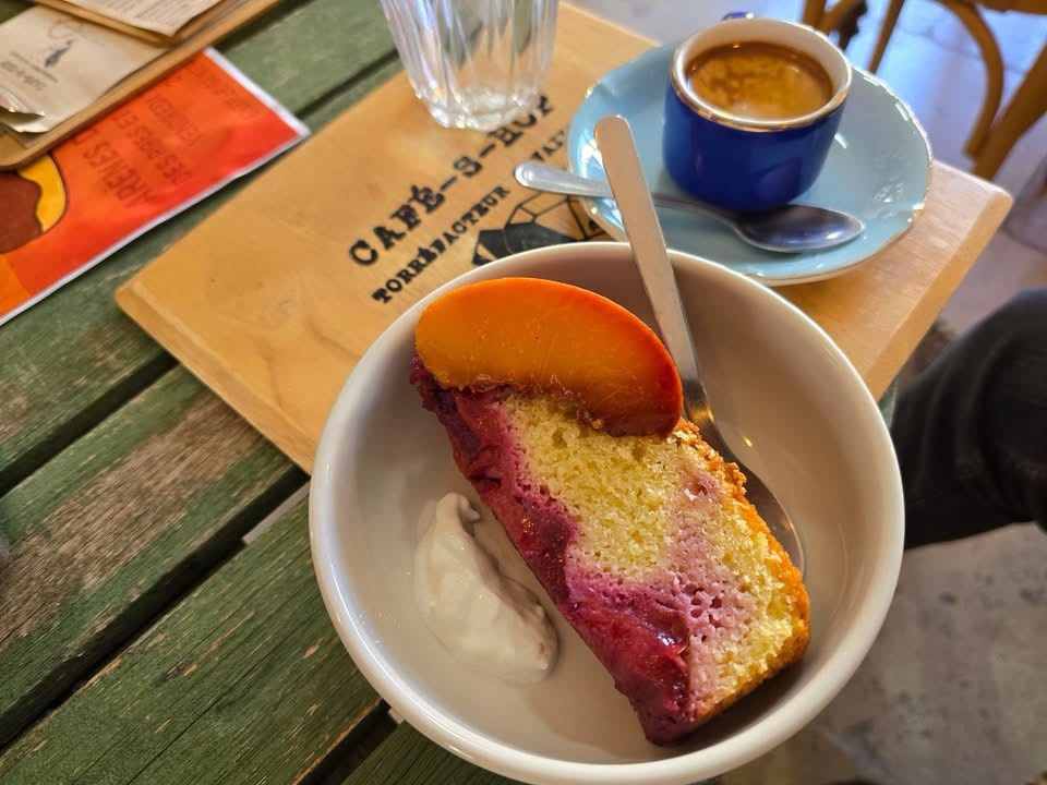 There was cake. Of course there was cake. A rustic slice – peach and red fruit folded into a golden sponge, gently sweet, served with a curl of ripe peach and a spoonful of crème fraîche just tart enough to restore perspective. Simple, and perfect.